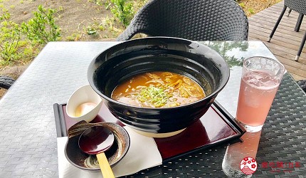 泡完溫泉后,就到神州溫泉ALGO之湯的餐廳「四季旬菜神崎」來用餐吧!推薦大家這里的名物「咖哩玄烏龍面(カレー玄うどん)」,含有水溶性食物纖維有益健康,而咖哩微辣的口感很適合泡完湯來一口,也有加入蔬菜、天婦羅的口味。坐在露天的座位上享受微風,身上還能感受到溫泉的余溫,實在是太享受了!