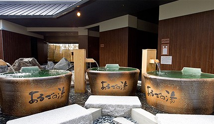 讓人玩到不亦樂乎的「神州溫泉ALGO之湯」露天池,一共有六種溫泉可以體驗。陶罐造型,適合沈浸在自我世界的單人用「壺湯」,讓人舒適到不想起身!而有著氣泡、仿佛泡在香檳中的「展望碳酸泉」,有很好的美肌效果,泡完肌膚都滑滑的喔!另外還有各種不同造景及療效的切石溫泉、巖溫泉、水溫泉,每個都泡一下,舒服的享受自在時光。