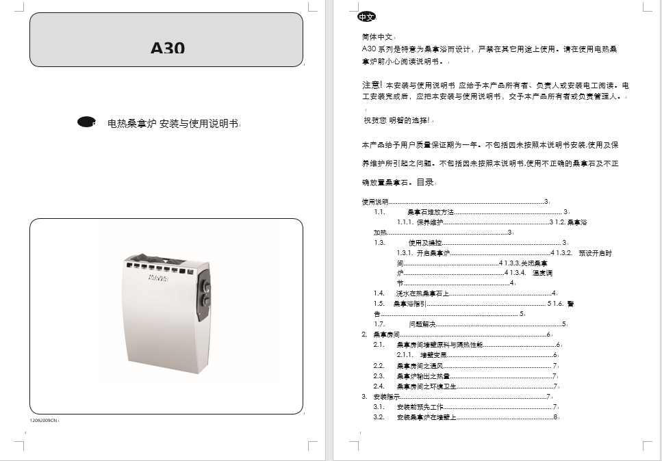 本產(chǎn)品給予用戶質(zhì)量保證期為一年。不包括因未按照本說明書安裝,使用及保養(yǎng)維護(hù)所引起之問題。不包括因未按照本說明書,使用不正確的桑拿石及不正確放置桑拿石。目錄